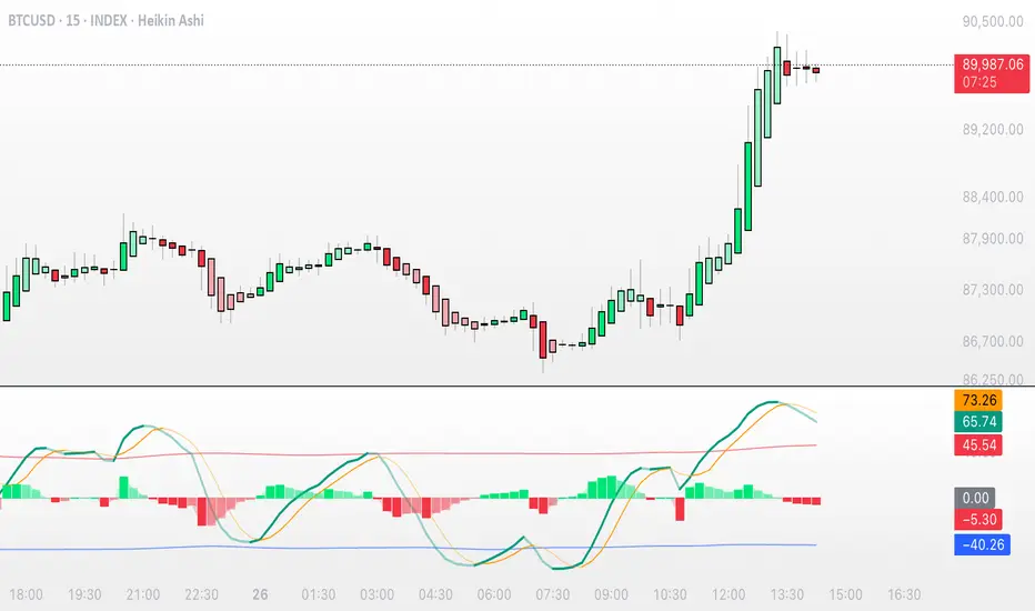 While standard WaveTrend uses price averages alone, this tool feeds a cumulative hybrid OBV source into WT1/WT2, producing a much more sensitive, order-flow-aware momentum signal. The result is a clean, MACD-style histogram built from the slope of WT1, revealing when volume-backed momentum flips from bullish to bearish and vice-versa.
