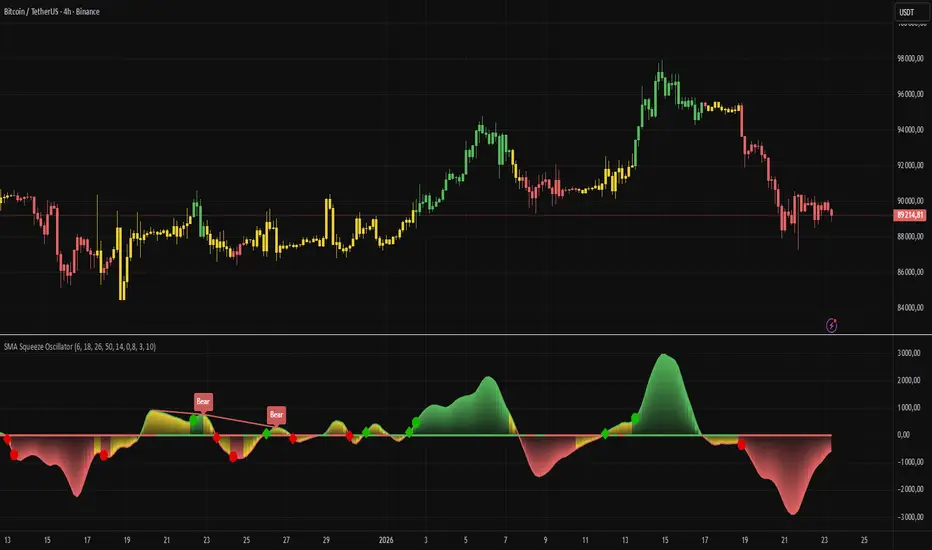 SMA Squeeze Oscillator is a momentum oscillator based on the relationship between multiple SMA moving averages. It combines volatility compression analysis (Squeeze), wave-style momentum structure, trend filtering, breakout signals, and divergence detection.