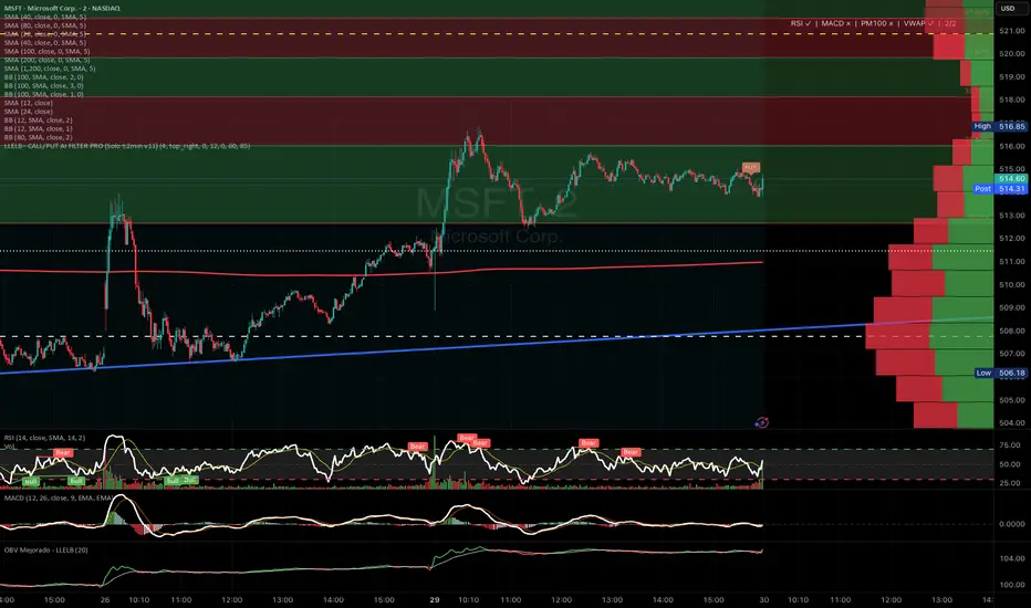 LLELB – CALL/PUT AI FILTER PRO is an intraday directional filter built specifically for 2-minute charts. It blends RSI (14), MACD (12/26/9), SMA100 (PM100), VWAP (hlc3) and a candle-intent check (body > 50% of range in the direction of the close) into a single score for bulls and bears. When either side reaches your confirmation threshold (factorConfirm, default 4), the indicator prints a CALL or PUT label and updates an optional compact status panel. Labels appear only when the state flips, reducing noise. Key settings include the confirmation threshold, panel visibility, compact mode, corner position and padding, plus border and opacity controls. Built-in alerts (“CALL 2min” and “PUT 2min”) are ready to use; for greater stability choose “once per bar close.” The script works entirely on the active 2-minute timeframe, avoids MTF lookahead, and does not repaint on bar close (values may evolve intrabar as expected). Use it as a direction filter alongside your own support/resistance and risk management. Educational use only—this is not financial advice.