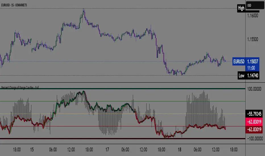 PCR Full is a custom momentum indicator that measures the percentage price change relative to a defined range, offering traders a unique way to evaluate strength, direction, and potential reversals in price movement.