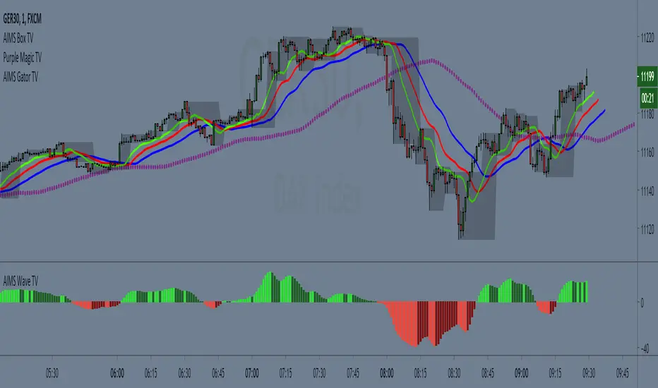 AIMS Gator together with the Purple Magic Line, https://www.tradingview.com/script/33FBvsvA-AIMS-Purple-Magic/ shows us the Red Line of M5 (5xHTF) on M1 (Current Time Frame).