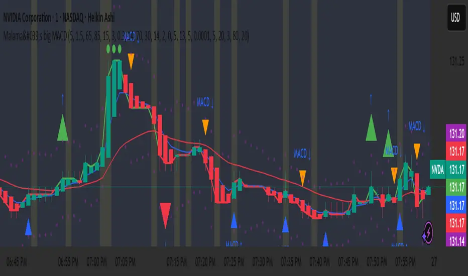 Purpose: Malama's Big MACD is a multi-faceted Pine Script indicator designed for traders on short timeframes (1-5 minute charts) to identify high-probability trading opportunities. It combines a Stochastic Price Predictor (SPP) with a comprehensive set of technical indicators, including MACD, RSI, moving average crossovers, ATR, volume spikes, and a custom JKH RSI, to generate robust buy and sell signals. The indicator aims to solve the problem of filtering out market noise in fast-moving markets by integrating probability-based predictions with traditional technical analysis, providing traders with clear entry/exit signals, trend visualization, and risk management levels.