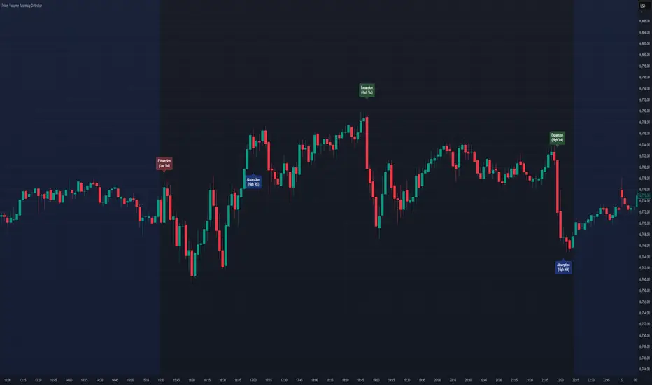 This indicator identifies unusual relationships between price strength and trading volume. By analyzing expected intraday volume behavior and comparing it with current activity, it highlights potential exhaustion, absorption, or expansion events that may signal changing market dynamics.