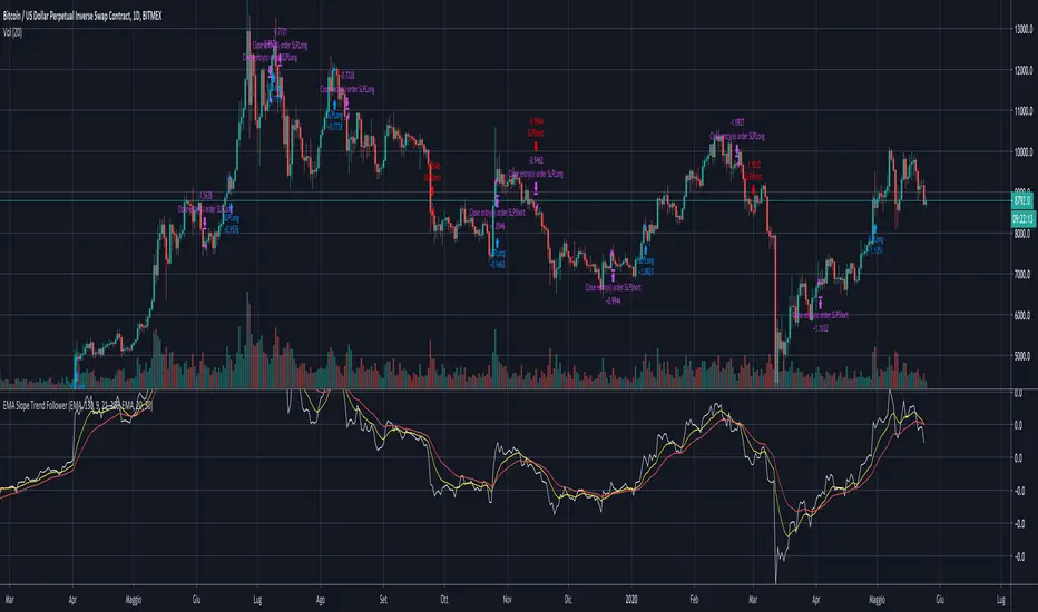 Calculating and analyzing two EMAs (fast and slow) over the slope of a medium length EMA instead of the price anticipates a lot the signal. In this way, the strategy never miss a trend.