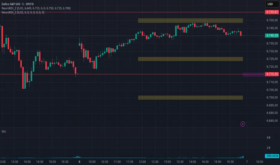 neurordi_z visualizes Gamma Push (support) and Gamma Resistance zones derived from options-market positioning. The script plots colored rectangles at user-defined price levels to highlight areas where market maker hedging can create directional pressure, absorption, or potential reversals.