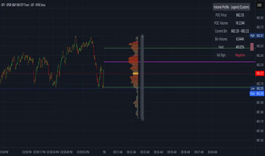 A rolling or session-based window determines how many recent bars are analyzed. Value Area (VA), Point of Control (POC), and total hits per bin are computed continuously. The display auto-adjusts as price moves, keeping the profile anchored to the latest visible bars.