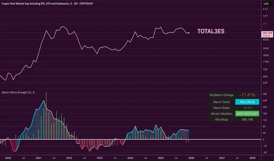 The Altcoin Relative Macro Strength indicator measures the altcoin market's price performance relative to global macroeconomic conditions. By comparing TOTAL3ES (total altcoin market capitalization excluding Bitcoin, Ethereum and stable coins) against a composite macro trend, the indicator identifies periods of relative overvaluation and undervaluation.
