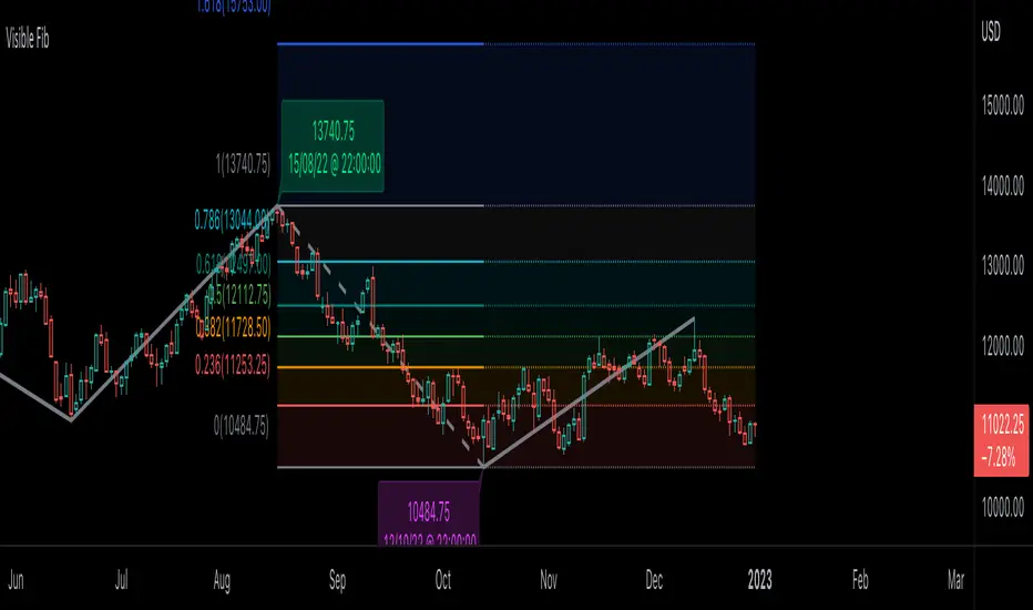 • Visible Zig Zag: This method uses historical pivots from a Zig Zag indicator for level calculation. The "nth Last Pivot" input in the script settings controls how many pivots back from the last visible one will be used to calculate the Fibonacci levels.