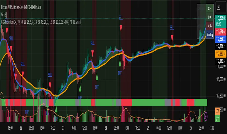Imagine trying to decide if Bitcoin is a "buy," "sell," or "wait" without staring at 10 different charts. The GXS Indicator does that for you—it's like a smart dashboard for BTC traders, overlaying signals right on your price chart. It boils down complex market clues into one easy score (from -1 "super bearish" to +1 "super bullish") and flashes green/red arrows or shaded zones when action's needed. No fancy math overload; just clear visuals like tiny triangles for trades, colored clouds for trends, and a bottom "mood bar" (green=up vibe, red=down, gray=meh).