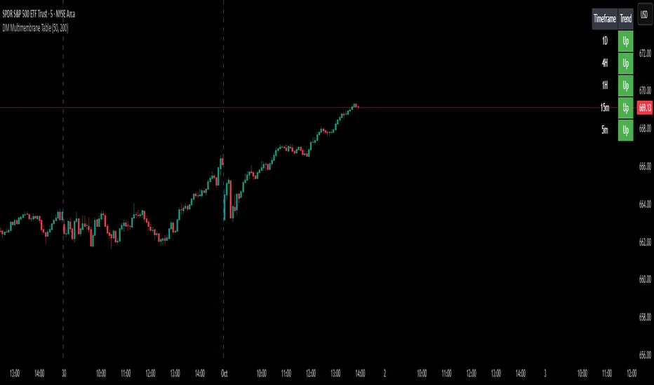 It’s designed to visually summarize the trend direction across several timeframes (1D, 4H, 1H, 15m, and 5m) — all in a compact table displayed on your chart.