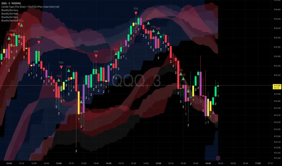 BlueSkyTerritory is a multi-timeframe volatility structure indicator designed to highlight periods of compression (price balance) and expansion (price movement) using widely known, non-proprietary mathematical concepts.