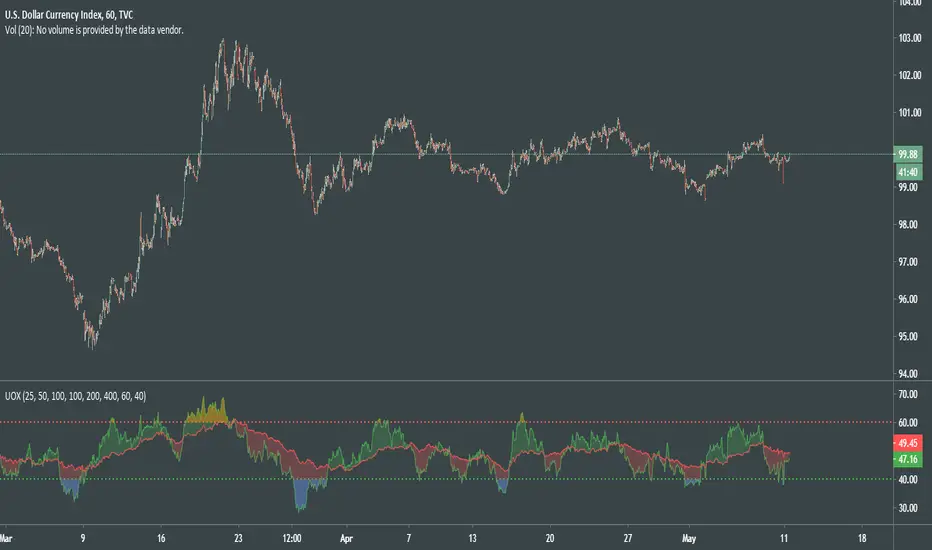 - When green UO index passes below 40, it's an alert that the market is about to interact to new demand levels, coloring it blue for a potential reversal.