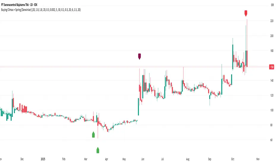 Advanced Wyckoff-based indicator that identifies potential market reversals through **Buying Climax** patterns (exhaustion tops) and **Spring** patterns (accumulation bottoms). Designed for traders seeking high-probability reversal signals with strict uptrend validation.