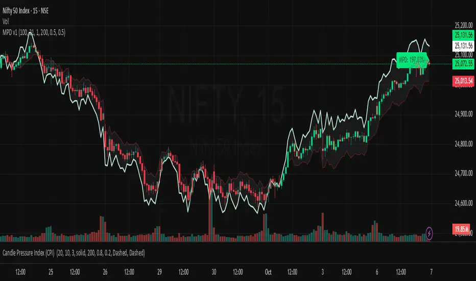 - Unlike standard momentum or trend indicators, MPD analyzes the structural behavior of each candle—its body, wicks, and overall range—to determine whether the market is dominated by expansion (buying aggression) or contraction (selling absorption).