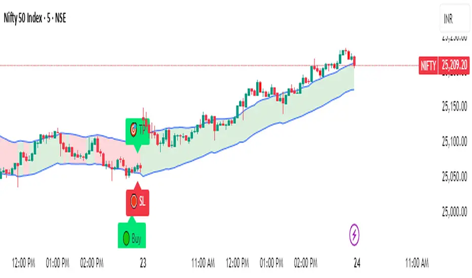 This indicator combines a volatility-adjusted trend cloud with RSI- and volume-based reversal signals to help traders visually spot potential trend continuation or reversal zones.