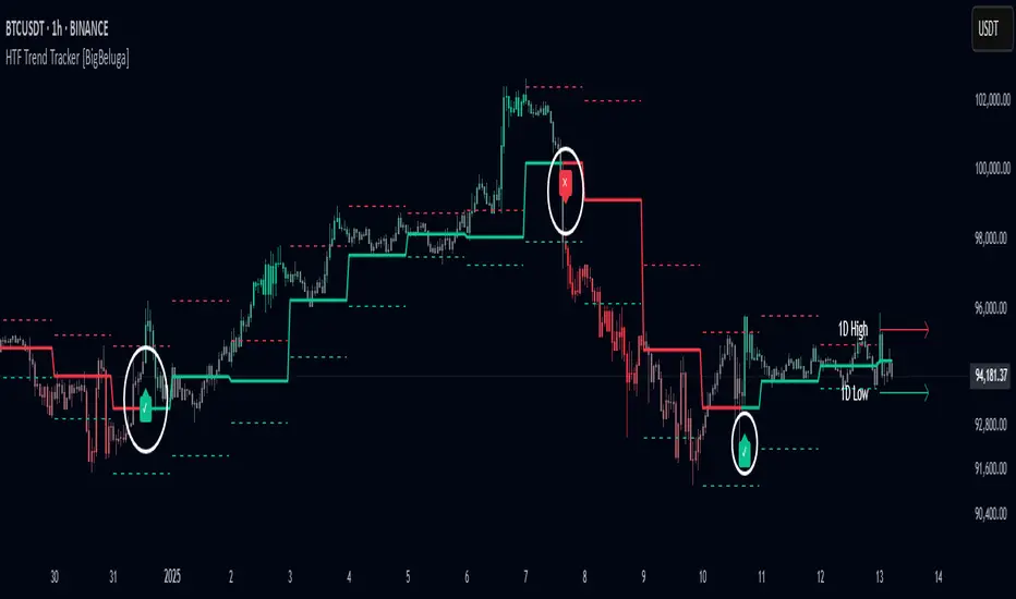 HTF Trend Tracker [BigBeluga] is a higher timeframe (HTF) trend tracking indicator designed to help traders identify significant trends, key levels, and market sentiment. The indicator dynamically adapts to the current price action, using HTF highs and lows to display trend direction and strength with detailed visuals.