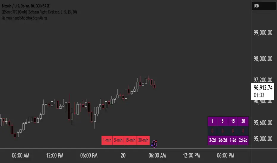 The updated Hammer and Shooting Star Alerts script provides advanced functionality for detecting hammer and shooting star candlestick patterns across multiple timeframes, while ensuring the alerts only trigger when the daily and hourly candles are aligned (or close) in terms of their price direction (bullish or bearish).Key Features: