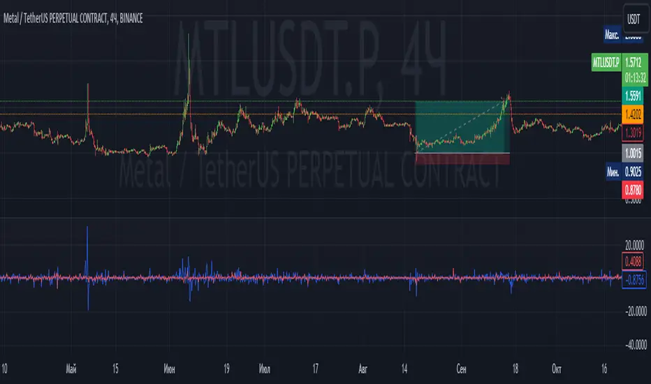 Этот индикатор с названием "Price Deviation" разработан для сравнения процентного изменения цены текущего инструмента (например, BNBUSDT.P) с инструментом сравнения (например, BTCUSDT.P) за определенный временной интервал. Он предоставляет опцию для сглаживания данных и отображает результаты в виде линий на графике. Синяя линия представляет собой процентное изменение цены текущего инструмента, а красная линия - процентное изменение цены инструмента сравнения. Кроме того, создаются метки для обоих инструментов, отображая их названия, с синей меткой для текущего инструмента и красной меткой для инструмента сравнения.
