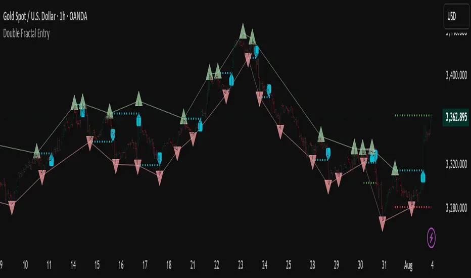 Double Fractal Entry is a proprietary indicator that uses dynamic fractal structure to generate actionable buy/sell signals, with automatic Stop-Loss and Take-Profit placement. Unlike classic fractal tools or ZigZag-based visuals, this script constructs real-time structural channels from price extremes and offers precise entry points based on breakout or rejection behavior.