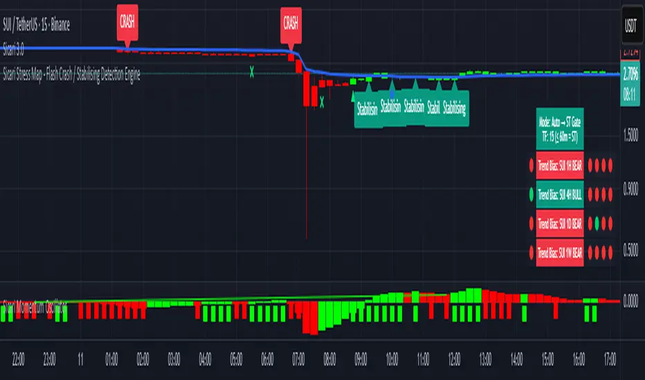 This engine keys off that first shock on 5m and bubbles it up to your chart TF as a single FLASHCRASH pulse. Then it watches for Stabilising, when panic fades: