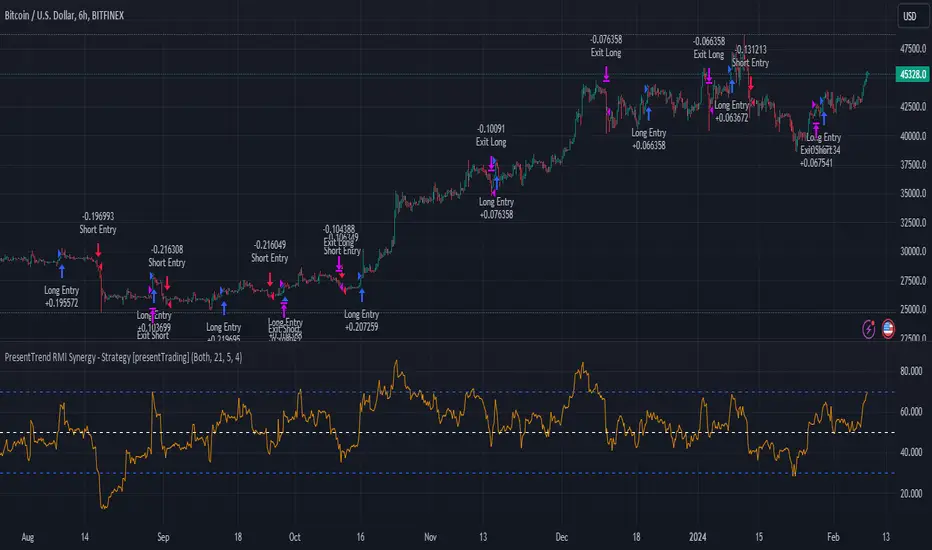 The "PresentTrend RMI Synergy Strategy" intricately combines the Relative Momentum Index (RMI) and a custom SuperTrend indicator to create a powerful tool for traders.