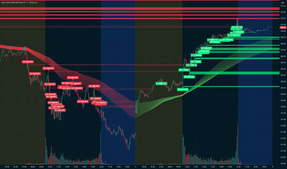 High-Confluence Signals: "BUY" and "SELL" labels are only plotted when a Ribbon Flip occurs simultaneously with a Volume Imbalance on the same bar.