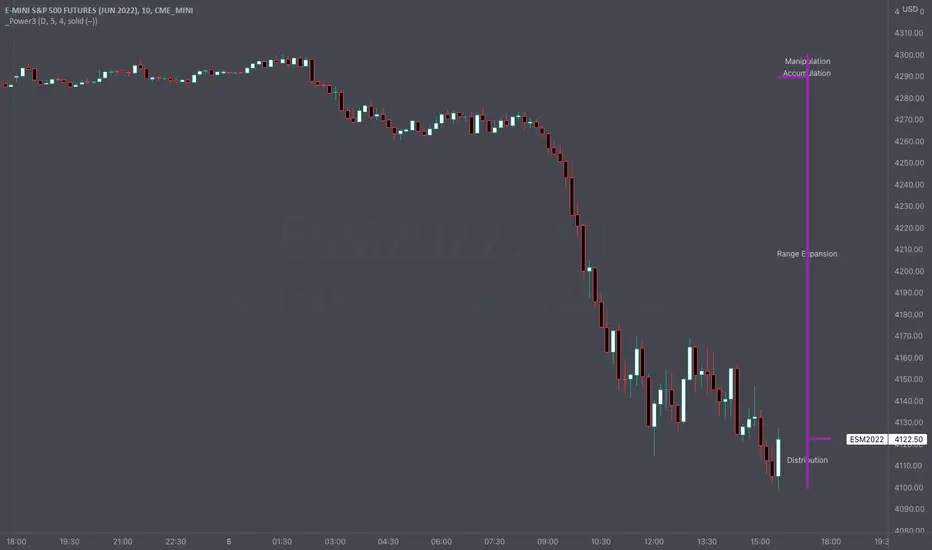 This indicator draws a dynamic "Open High Low Close" type visual on intraday charts so the trader can easily keep track of the daily/weekly movement. This indicator was inspired by the Inner Circle Trader’s (ICT) “Power 3” concept, which is Accumulation, Manipulation, and Distribution of price on a daily timeframe.
