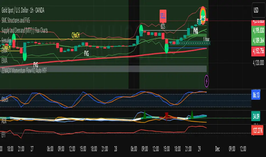 A clean & disciplined trend-momentum indicator designed for traders who want clarity, simplicity, and market alignment. Inspired by Zen Flow Trading, this version combines multi-timeframe trend structure with precise momentum signals.