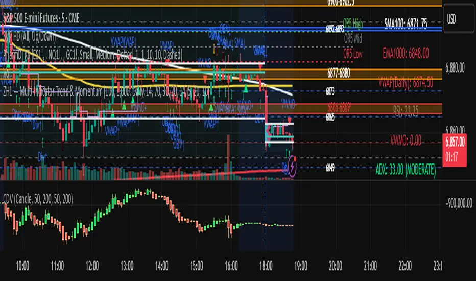 Combines multiple oscillators (including Cumulative Delta) for overall momentum. ADX thresholds define trend strength.