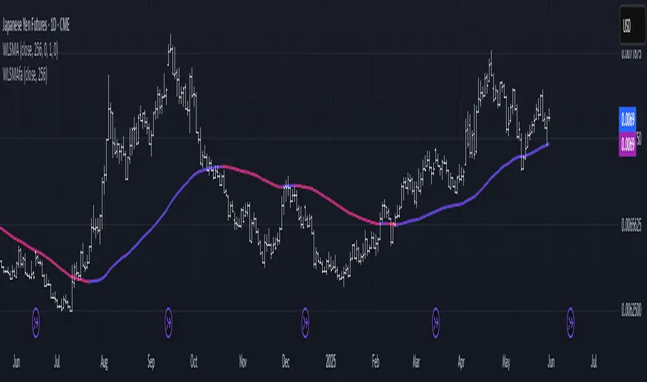 This script is remake of my 1st degree WLSMA via linear filter combo. It’s much faster, we aint calculate moving regression per se, we just match its freq response. You can see it on the screen (WLSMAfa) almost perfectly matching the original one (WLSMA).