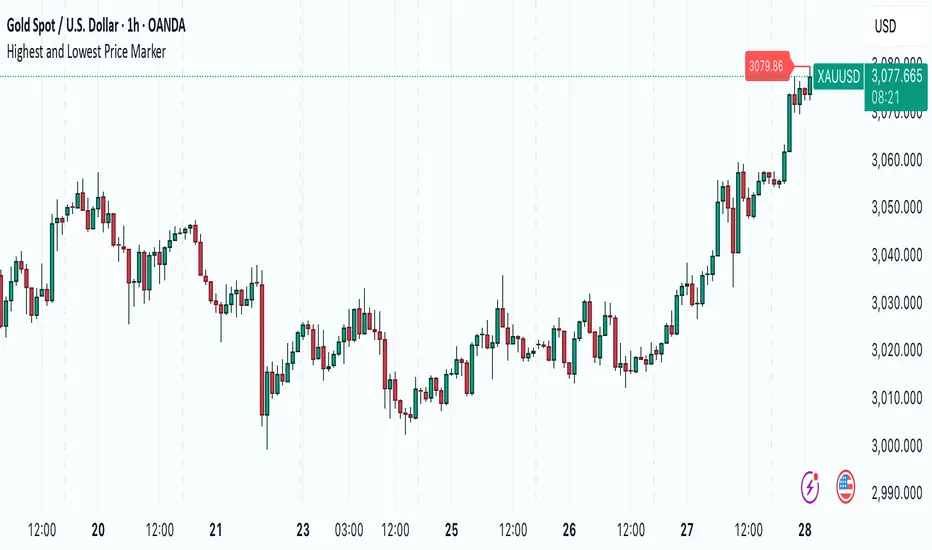 This indicator scans the past 100 bars to pinpoint the most extreme price levels, marking the highest and lowest values on your chart. It adds dynamic labels and connecting lines that visually capture these key price points, providing you with a clear reference of where significant price movements have occurred over your chosen period.By displaying these price markers in real time, the tool gives you an intuitive snapshot of market extremes, enabling you to better monitor sudden shifts and evaluate market sentiment. Whether you're tracking intraday volatility or analyzing longer-term trends, this indicator serves as a practical guide to the price action that matters most.