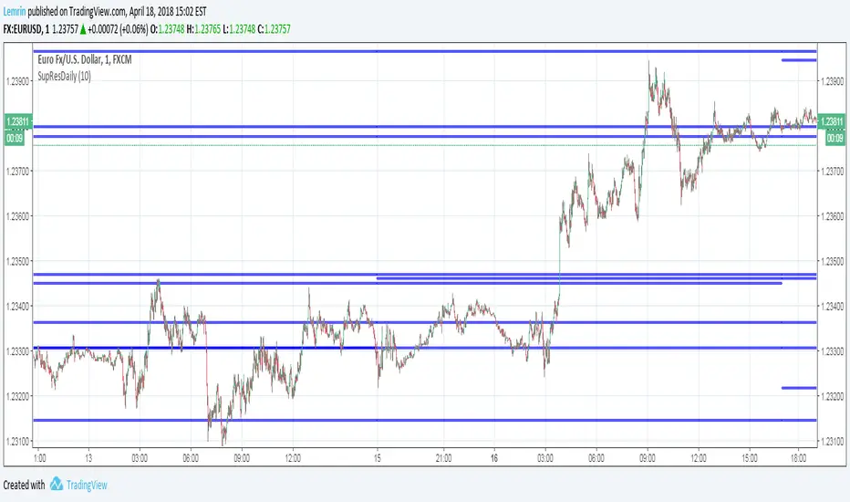 This indicator plots horizontal lines for the high and low of each of the last x days (configurable from 1 to 20).  Increasing this number beyond 20 is not possible due to some technical Pine limitations.  I am also publishing a weekly and monthly version.  Written for TV user: kvpatel