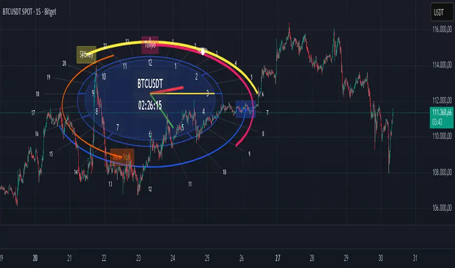 3D Session Clock | Live Time with Sessions [CHE] — Projects a perspective clock face onto the chart to display current time and market session periods for enhanced situational awareness during trading hours.