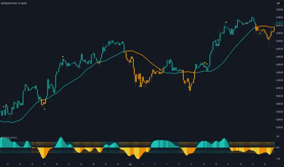 The Moving Average Shift [ChartPrime] indicator is a powerful tool that merges trend-following and mean reversion strategies into one comprehensive system. By allowing traders to select different types of moving averages, it provides flexibility in trend analysis while visually enhancing price action with dynamic candle coloring. The MA Shift Oscillator further strengthens decision-making by detecting deviations and highlighting potential mean reversion points.
