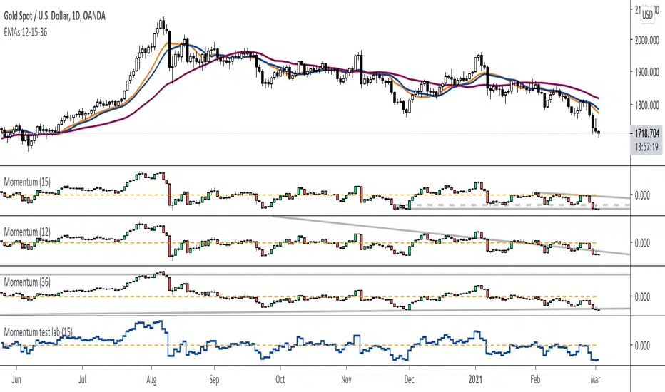 The momentum is calculated with the price ratio to its SMA. On the short term it is used as a variation of the price to the SMA 15 days (equivalent 3 weeks). The middle term it is used as the weekly price vs the SMA 12 weeks (equivalent 3 months) and on the long term as the monthly price vs the SMA 36 months (equivalent 3 years).