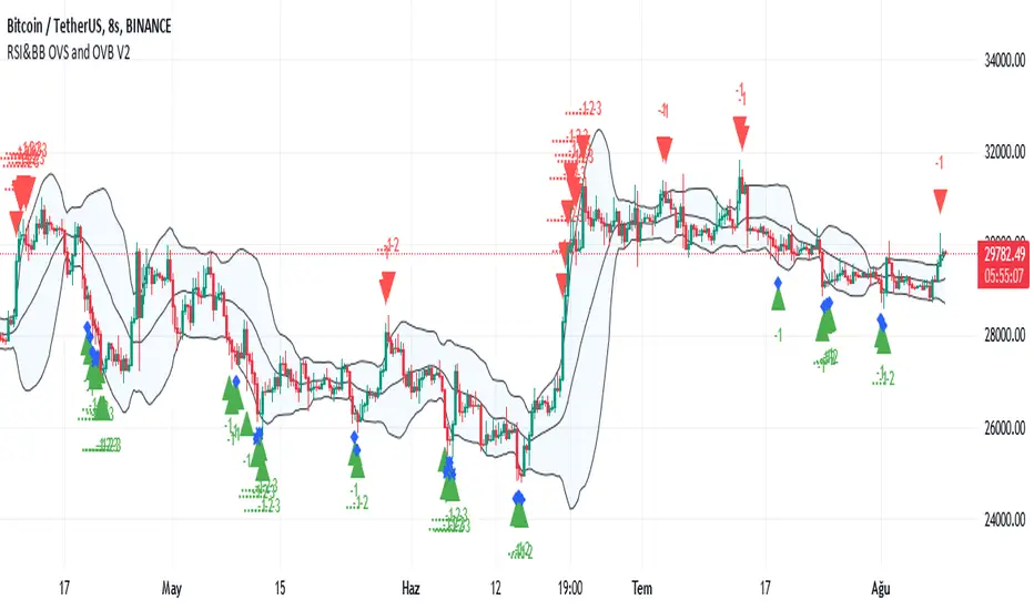 ENG : This indicator is created by combining the standard period RSI indicator with an Oversold limit of 32, an Overbought limit of 70 and a period of 14 (these values can be changed optionally from the entries and still tabs of the indicator settings) and the Bollinger Band. indicator with a standard deviation of 2 and a period of 20. Also, the RSI Oversold is an upward green triangle where the price simultaneously falls below the BB and the lower limit (Low) (i.e. below 32), where the RSI Overbought (i.e. above 70) at the same time the price rises above the BB and the upper limit (Upper) is a downward red triangle. is indicated by a triangle. An alarm condition is established on these conditions. Source codes are posted visually and written in clear language and with explanations for beginners to learn to pine.