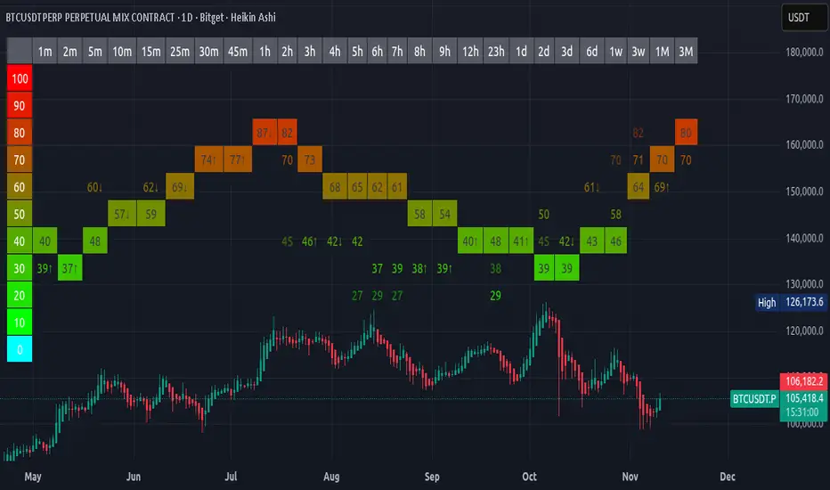 The RSI Multi-Timeframe Heatmap displays the Relative Strength Index (RSI) across multiple timeframes in a single, easy-to-read visual grid.
