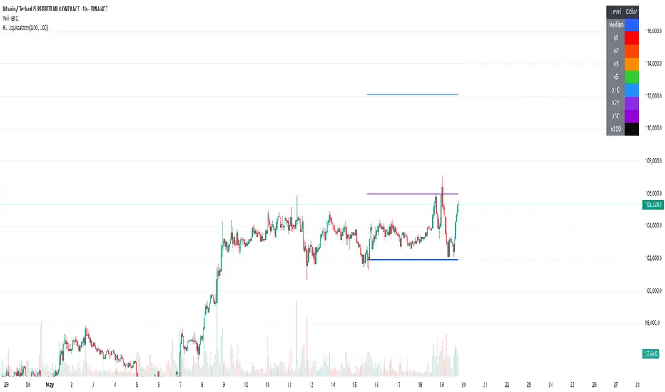 This tool visually marks these critical zones, offering insight into areas where over-leveraged positions (such as x1, x2, x5, up to x100) are more likely to get liquidated, either above the recent low or below the recent high. This can support risk management and decision-making, especially in volatile markets.