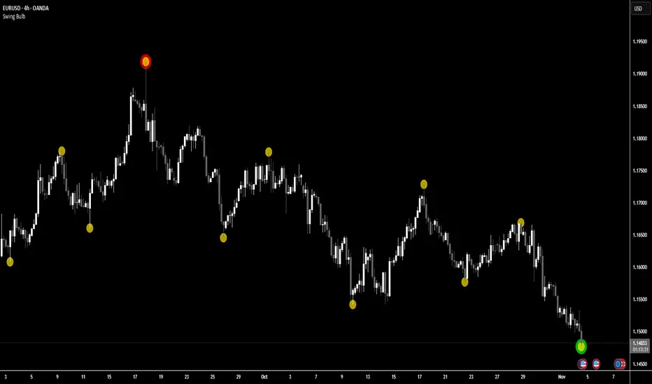 The Swing Point Bulb indicator detects and visualizes swing reversal points in price using a two-tier adaptive wave logic.It highlights key turning zones where the market may be overbought or oversold, helping traders identify potential trend reversals or retracement pivots.