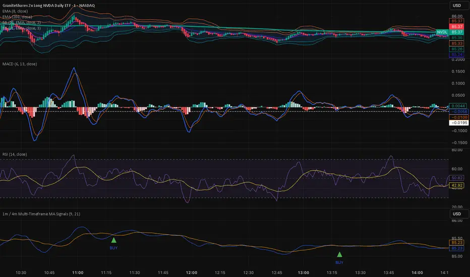 This strategy is designed to send laser crisp buy and sell signals on a 1 minute chart after also analyzing the 4 minute chart and removing the noise in the 1 minute chart.