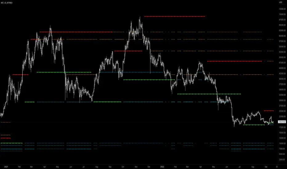 The blue and orange S/Rs (secondary S/Rs) are echoes of the green/red S/Rs (main S/Rs) that are close (to the current price) to the past. There are a maximum of 5 levels of secondary S/R on either side of the price. The intensity of the color and the strength of the line also gives information about the proximity and importance of the S/R. When the blue/orange dots are connected, it means that it is the same S/R from the past that continues to be at the same level.
