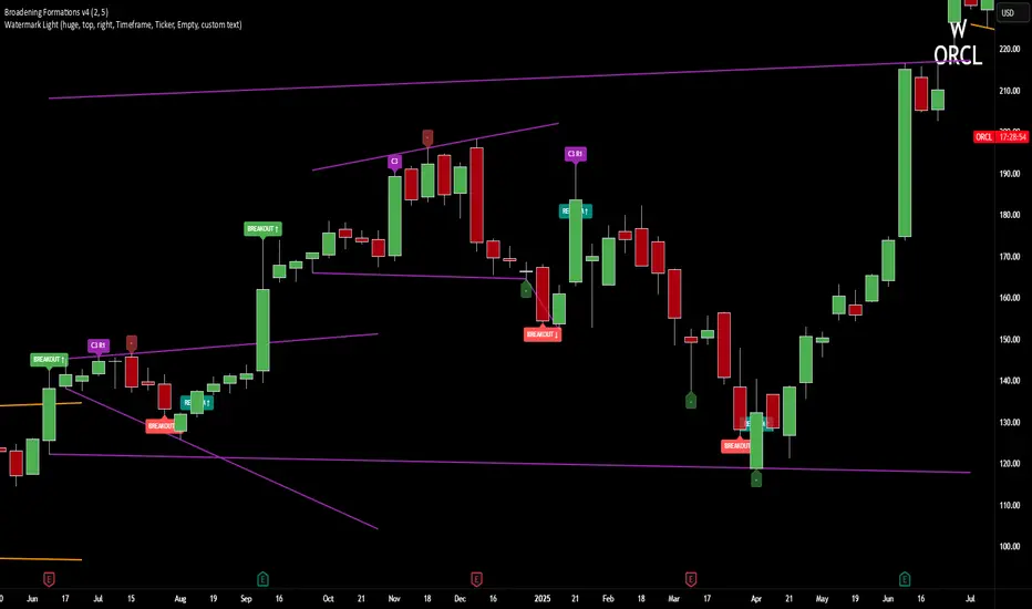 Automatically identifies and draws Broadening Formations — expanding price structures that reveal where the market is auctioning both higher and lower to find fair value.