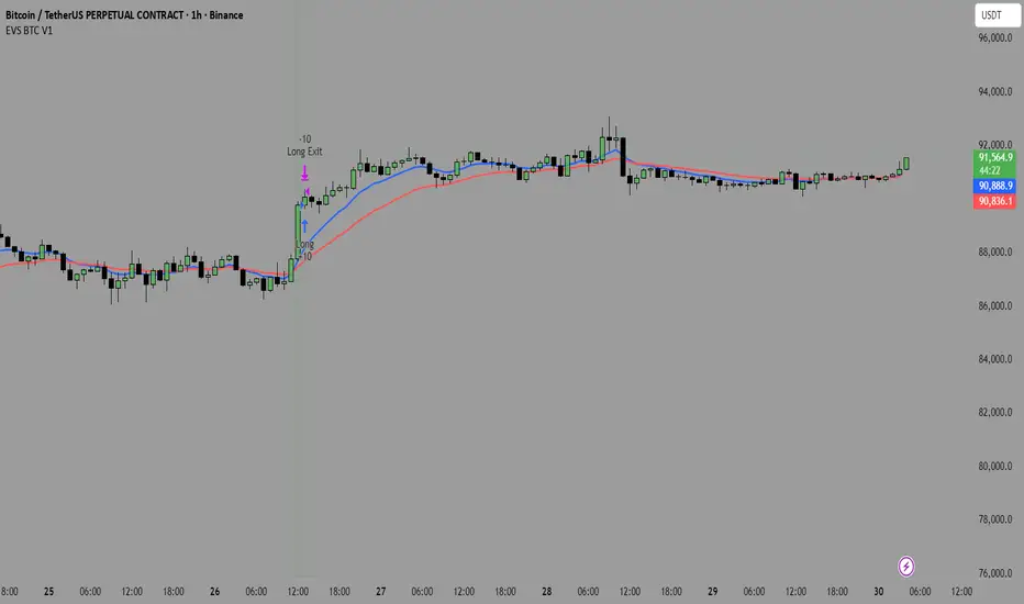 The "EVS BTC V1" is a momentum-based trading strategy designed for Bitcoin (BTC) or similar volatile assets on TradingView. It combines Exponential Moving Averages (EMAs) for trend direction, volume confirmation to filter for strong moves, and an optional Relative Strength Index (RSI) filter to avoid overextended entries. The strategy uses a trailing stop for exits to lock in profits dynamically. It's set up for backtesting with an initial capital of $10,000, risking 10% of equity per trade, and accounting for 0.1% commissions.This is a crossover strategy: it goes long on bullish EMA crossovers with high volume (and RSI not overbought) and short on bearish crossunders (with high volume and RSI not oversold). It's overlayed on the main price chart for easy visualization.Key Parameters (User-Adjustable)Fast EMA Period: 9 (default) – Shorter-term trend line.