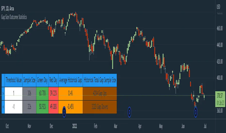 This indicator displays a table with statistics showing the outcomes of gap ups or downs based on your threshold (i.e. does the day end in green or red?). This can be useful for trading, where you're using relevant ETFs & see that they've gapped up/down, & can assume based on statistics that the ETF will end in green/red depending on which has the higher probability (however, you can use these on any other instruments such as stocks to find edges e.g. seeing whether stock XYZ is more likely to end in green/red when it gaps up 100%).