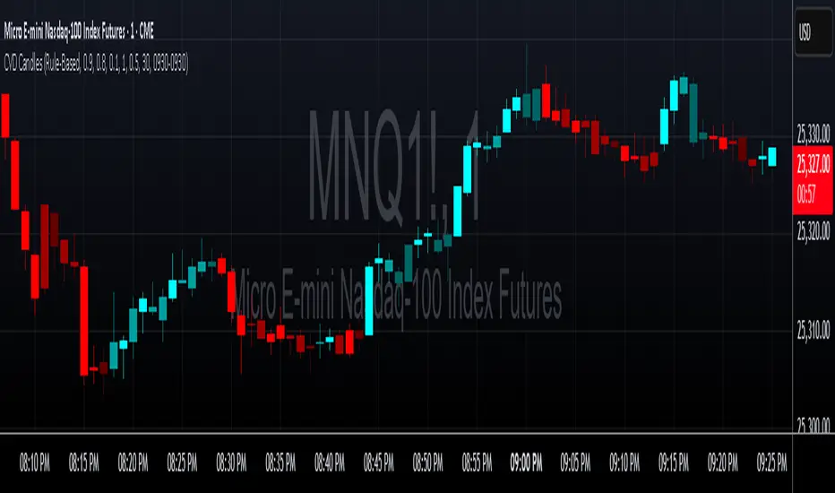 Visualize buying and selling pressure directly on your price candles. This indicator colors your candlesticks based on Cumulative Volume Delta (CVD), helping you see the underlying order flow driving price action.