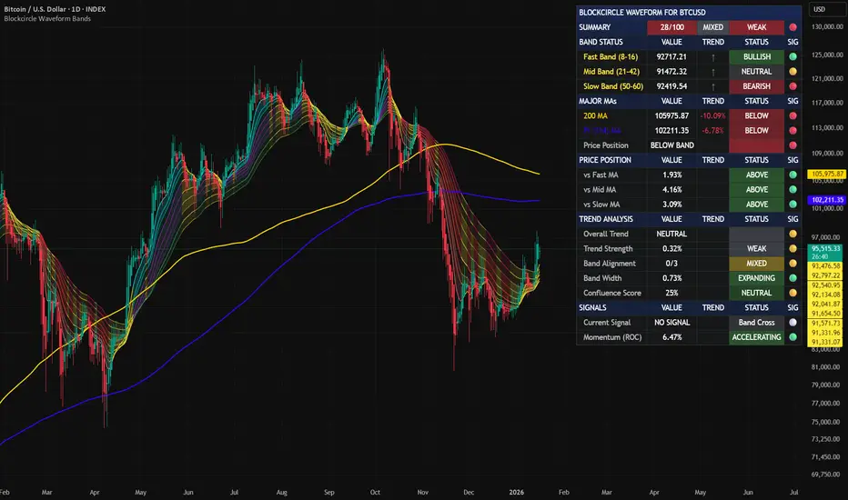 The Blockcircle Waveform Bands is a comprehensive trend-following indicator built around a layered moving average ribbon system. The core idea is simple: when shorter-term averages stack above longer-term ones in proper sequence, the trend is healthy. When they compress, cross, or invert, something is changing.