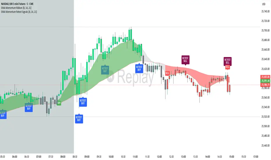 This combined indicator merges Trend Identification (Ribbon) with Price Action Signals (Retests) to create a complete trading system.
