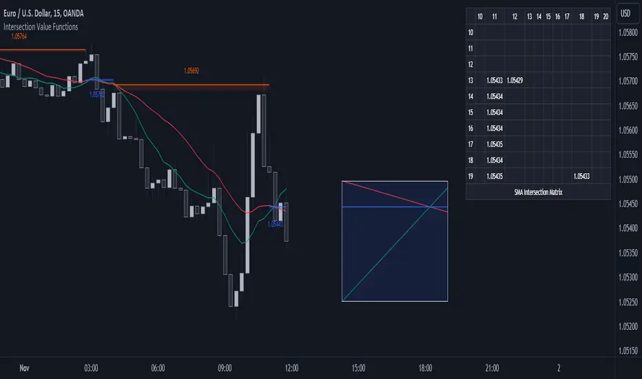 In the script, we create an intersection matrix from an array containing the outputs of simple moving averages with a period in a specific user set range and can highlight if a simple moving average of a certain period crosses with another moving average with a different period, as well as the intersection value.