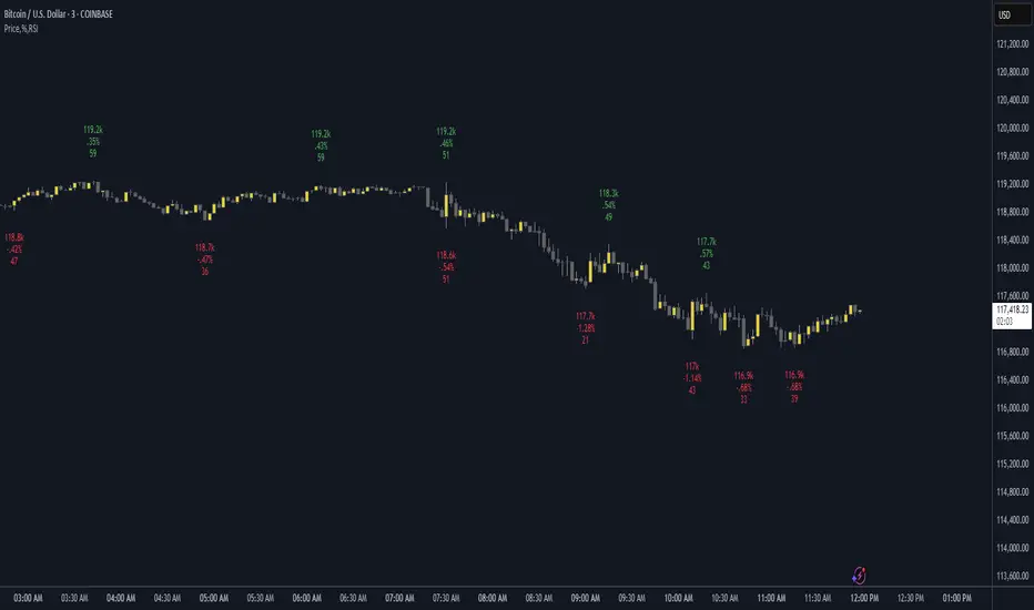 The main objective of this indicator is to be able to spot high and low prices easily with the price % change between the same 2 data sets. Additionally and arguably more importantly, with the RSI values associated with the high and low prices, you can spot divergences easily - meaning the price is making a higher high while conversely the RSI value at the next pop (around the same price as previous high) is lower which can mean that momentum has exhausted for the time being and a reversal could be imminent.