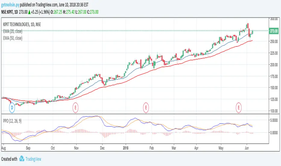 The Percentage Price Oscillator (PPO) is a momentum oscillator that measures the difference between two moving averages as a percentage of the larger moving average. As with its cousin, MACD, the Percentage Price Oscillator is shown with a signal line, a histogram and a centerline. Signals are generated with signal line crossovers, centerline crossovers, and divergences. First, PPO readings are not subject to the price level of the security. Second, PPO readings for different securities can be compared, even when there are large differences in the price.